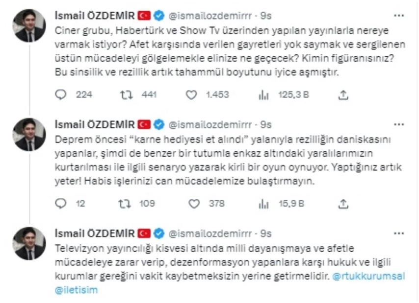“Ciner grubu, Habertürk ve Show Tv üzerinden yapılan yayınlarla nereye varmak istiyor? Afet karşısında verilen gayretleri yok saymak ve sergilenen üstün mücadeleyi gölgelemekle elinize ne geçecek? Kimin figüranısınız? Bu sinsilik ve rezillik artık tahammül boyutunu iyice aşmıştır.