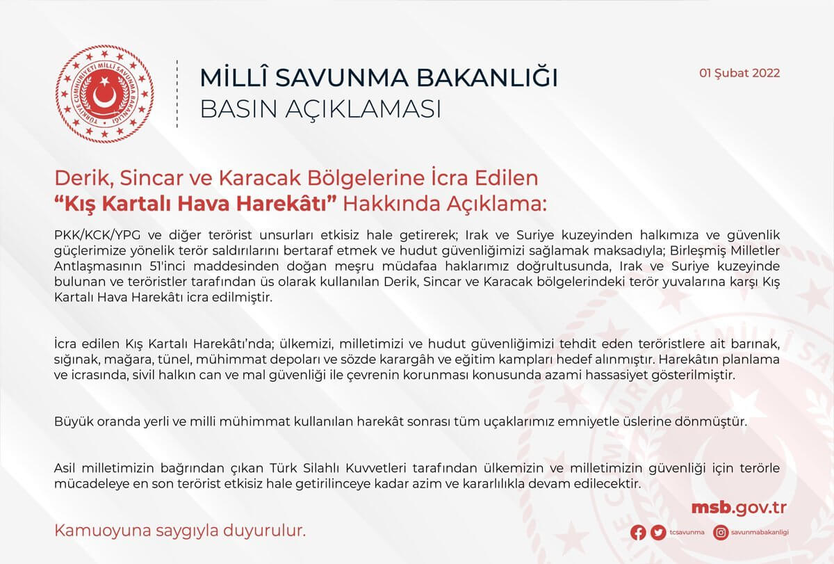 “PKK/KCK/YPG ve diğer terörist unsurları etkisiz hale getirerek; Irak ve Suriye Kuzeyinden halkımıza ve güvenlik güçlerimize yönelik terör saldırılarını bertaraf etmek ve hudut güvenliğimizi sağlamak maksadıyla; Birleşmiş Milletler Antlaşmasının 51’inci maddesinden doğan meşru müdafaa haklarımız doğrultusunda, Irak ve Suriye Kuzeyinde bulunan ve teröristler tarafından üs olarak kullanılan Derik, Sincar ve Karacak bölgelerindeki terör yuvalarına karşı Kış Kartalı Hava Harekâtı icra edilmiştir” denildi.