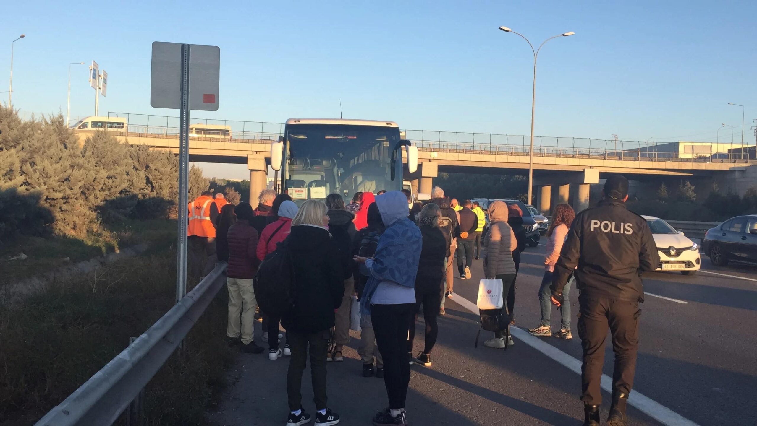 TEM Otoyolu OSB mevkisinde sabah saatlerinde Ankara yönüne giden İspanyol turistlerin bulunduğu 06 AT 5045 plakalı tur otobüsü arıza yapınca sürücü Sadık Çalışkan, aracını emniyet şeridine çekti.