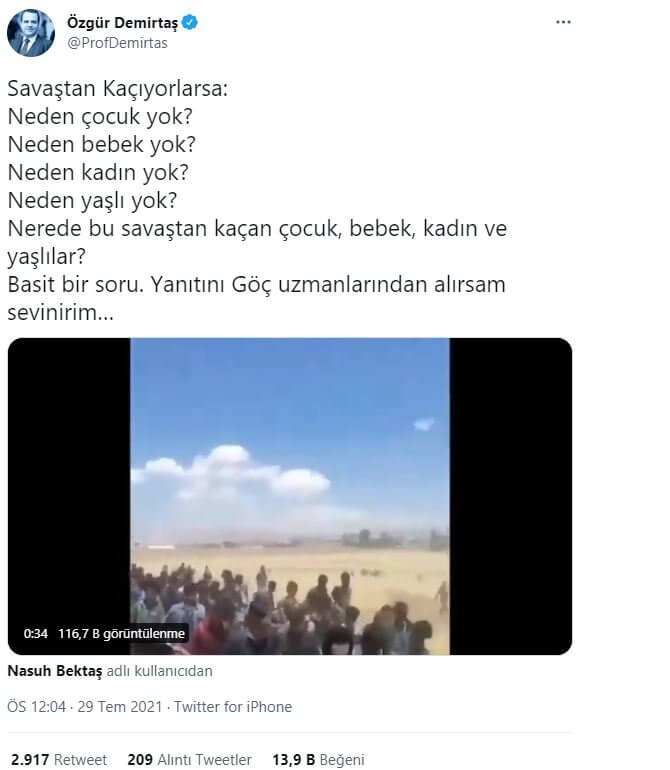 Taliban’ın saldırılarının artmasıyla beraber ülkelerinden kaçan Afganların Türkiye’ye göçü sürerken, ünlü ekonomist Özgür Demirtaş’tan gündem yaratacak bir detay geldi. Demirtaş, “Nerede bu savaştan kaçan çocuk, bebek, kadın ve yaşlılar? Basit bir soru. Yanıtını göç uzmanlarından alırsam sevinirim” dedi.