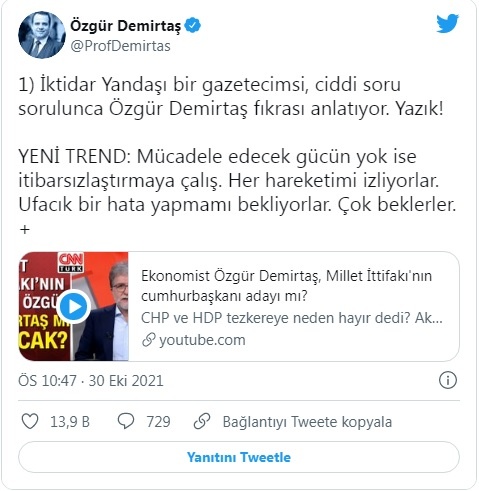 Kişisel Twitter hesabında yaptığı paylaşımlarda ilk olarak “İktidar yandaşı bir gazetecimsi, ciddi soru sorulunca Özgür Demirtaş fıkrası anlatıyor. Yazık! Yeni trend: Mücadele edecek gücün yok ise itibarsızlaştırmaya çalış. Her hareketimi izliyorlar. Ufacık bir hata yapmamı bekliyorlar. Çok beklerler” ifadesini kullandı.