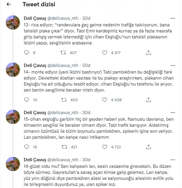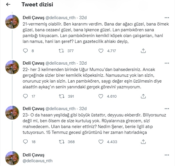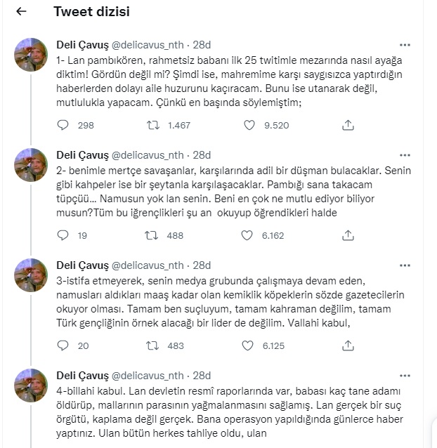 Yıldırım Demirören’in Ziraat Bankası’na olan milyonluk kredi borcunu ödemediğini de söyleyen Peker, ‘Lan pambıkören, devlete olan borcunu ödemezsin, normal insanlara olan borcunu da ödemezsin. Kan, gözyaşı ve cinayetlerle oluşturulan bir servetin de üzerinde oturan kahpesin, haramzadesin’ dedi.