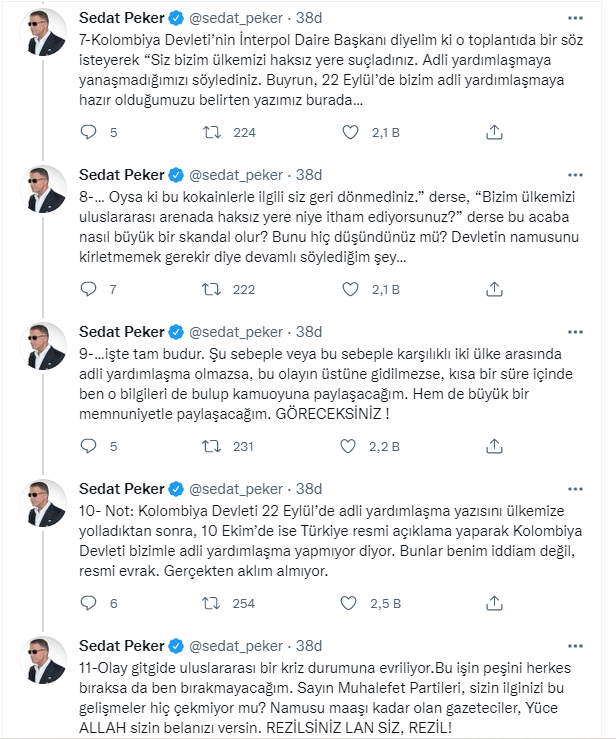 İçişleri Bakanı Süleyman Soylu’nun toplantıda konuşma yapacağını belirten Peker, ”Kolombiya Devleti’nin İnterpol Daire Başkanı diyelim ki o toplantıda bir söz isteyerek “Siz bizim ülkemizi haksız yere suçladınız. Adli yardımlaşmaya yanaşmadığımızı söylediniz. Buyurun, 22 Eylül’de bizim adli yardımlaşmaya hazır olduğumuzu belirten yazımız burada Oysa ki bu kokainlerle ilgili siz geri dönmediniz derse ne olur?” diye sordu.