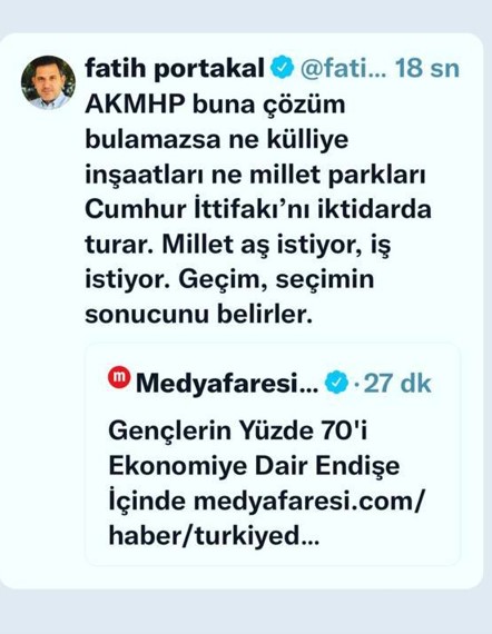 Ekonomik İşbirliği ve Kalkınma Teşkilatı’nın (OECD) son araştırmasında Türkiye’de gençlerin yüzde 70’inin ekonomik endişe içinde olduğunu belirten Portakal ‘Geçim seçimin sonucunu belirler’ dedi.