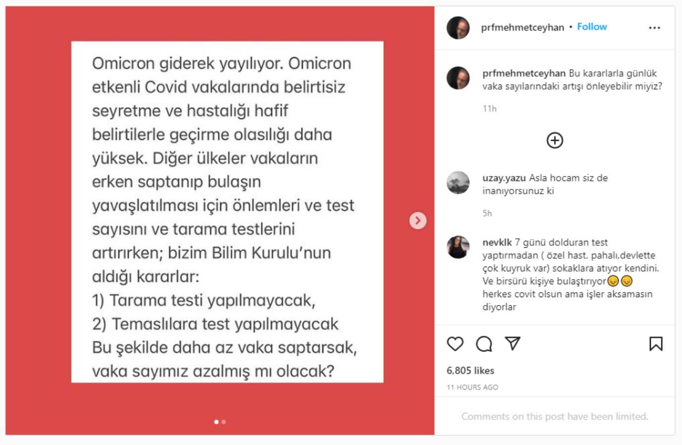 Hacettepe Üniversitesi Tıp Fakültesi Çocuk Enfeksiyon Hastalıkları Bilim Dalı Başkanı Prof. Dr. Mehmet Ceyhan, sosyal medya hesabından yaptığı paylaşımda, Koronavirüs Bilim Kurulu’nun aldığı kararlara tepki gösterdi.
