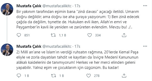 “Bir yakınım tarafından eşimin bana “zinâ davası” açacağı iletildi. Umarım doğru değildir; ama doğru ise aha şuraya yazıyorum: 1) Ben zinâ edecek çağda da değilim, tıynette de. Hukuken evli iken, Allah’ın emri ve Peygamber’in kavli ile yeniden ve zarûreten evlendim. Mevzu bu!”