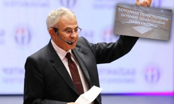 Sözcü’den Ahmet Kaya’nın haberine göre, Özaydın, kent protokolünün yanı sıra, çok sayıda öğrencinin doldurduğu salonda bir sunum yaptı. Sunum sırasında ekrana, “Soyunma Odası Yazısının Giyinme Odası olarak Değiştirilmesi” yazısı yansıtıldı.