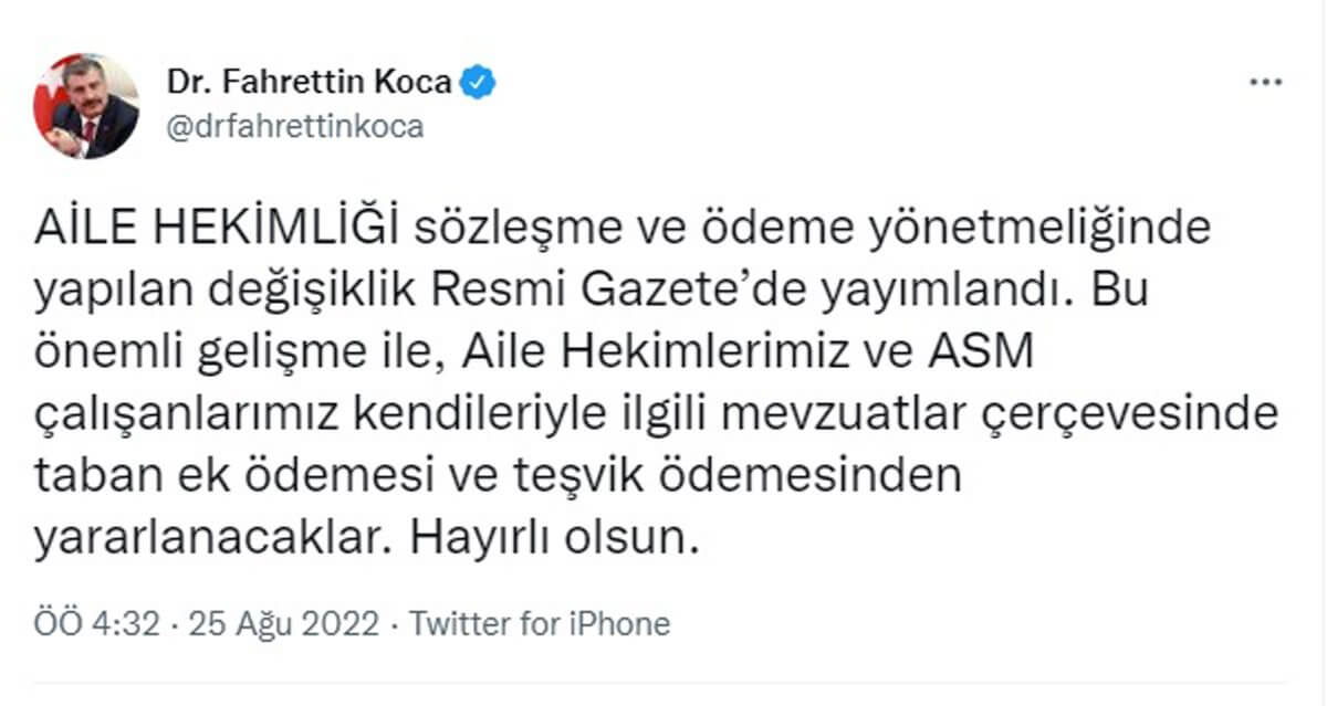 Resmi Gazete’de Cumhurbaşkanı Erdoğan’ın imzasıyla yayımlanarak yürürlüğe giren ‘Aile Hekimliği Sözleşme ve Ödeme Yönetmeliğinde Değişiklik Yapılmasına Daire Yönetmelik’ için Sağlık Bakanı Koca bir mesaj yayımladı. Koca, Twitter hesabından yayımladığı mesajında “Aile hekimliği sözleşme ve ödeme yönetmeliğinde yapılan değişiklik Resmi Gazete’de yayımlandı. Bu önemli gelişme ile, Aile Hekimlerimiz ve ASM çalışanlarımız kendileriyle ilgili mevzuatlar çerçevesinde taban ek ödemesi ve teşvik ödemesinden yararlanacaklar. Hayırlı olsun” ifadelerini kullandı.