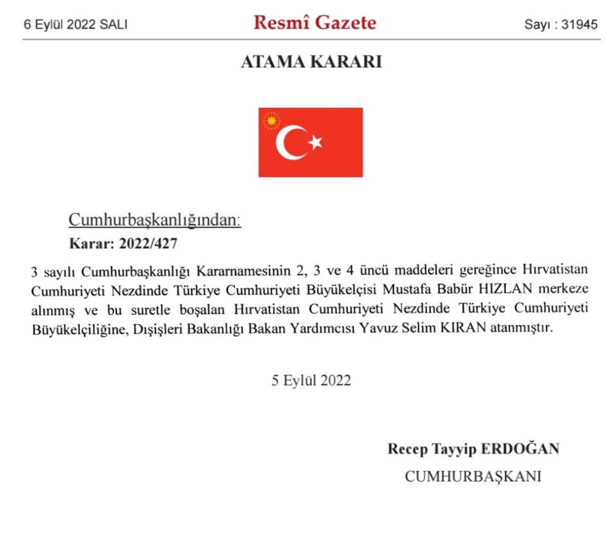 Cumhurbaşkanı Recep Tayyip Erdoğan, Hızlan’dan boşalan Hırvatistan Büyükelçilik görevine Dışişleri Bakanlığı Bakan Yardımcısı Yavuz Selim Kıran’ı atadı.