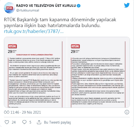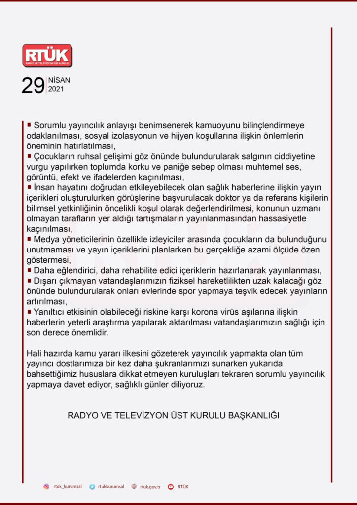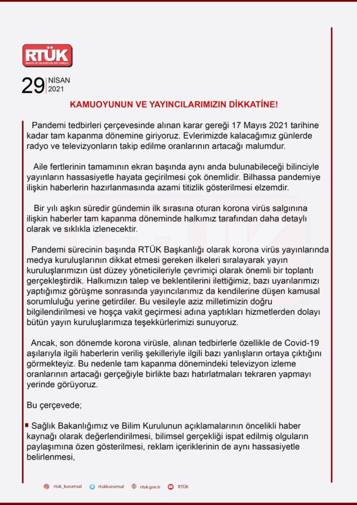 Radyo ve Televizyon Üst Kurulu (RTÜK) tarafından, ‘Kamuoyunun ve yayıncıların dikkatine’ başlığıyla yazılı açıklama yaptı. Açıklamada pandemi tedbirleri çerçevesinde alınan karar gereği 17 Mayıs 2021 tarihine kadar tam kapanma dönemine girildiği, evde kalınacak bu günlerde radyo ve televizyonların takip edilme oranlarının artacağına dikkat çekildi. Aile fertlerinin tamamının ekran başında aynı anda bulunabileceği bilinciyle yayınların hassasiyetle hayata geçirilmesinin çok önemli olduğu, özellikle pandemiye ilişkin haberlerin hazırlanmasında azami titizlik gösterilmesinin elzem olduğu vurgulandı.