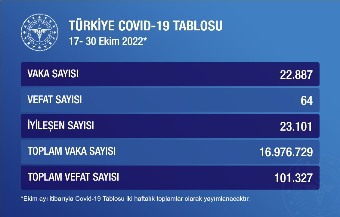 Sağlık Bakanlığı iki haftalık koronavirüs tablosunu açıkladı. Bune göre 17-30 Ekim haftasında 22 bin 887 kişinin koronavirüs testi pozitif çıktı, 64 kişi yaşamını yitirdi.