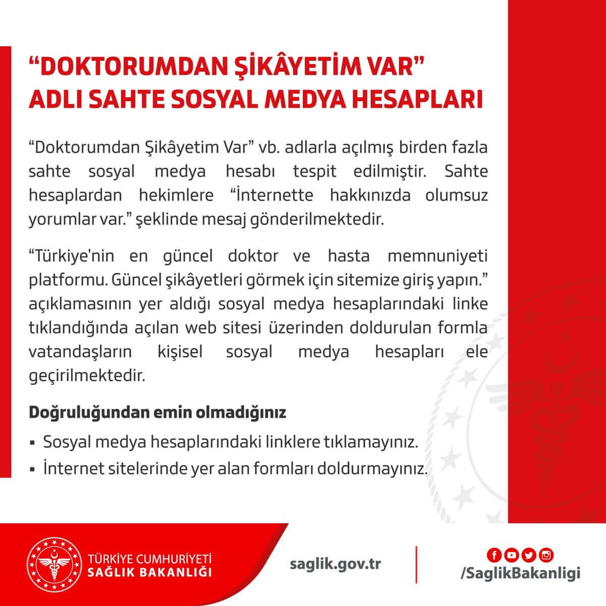 Sağlık Bakanlığı, Twitter hesabından, vatandaşları uyardı. ‘Doktorumdan şikayetim var’ ve benzeri adlarla açılmış birden fazla sahte sosyal medya hesabı tespit edildiğini duyuran bakanlık, sahte hesaplardan hekimlere ‘internette hakkınızda olumsuz yorumlar var’ şeklinde mesaj gönderildiğini belirtti.