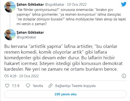 “Bu kervana ‘artistlik yapma’ lafına artistler, “bu olanlar resmen komedi, komik oluyorlar artık” gibi laflara komedyenler gibi devam eder durur. Bu lafların hiçbiri hakaret içermez. İsteyen istediği gibi konuşsun demokrat kardeşler. Ne yeri, ne zamanı, ne ortamı bunların bence.”