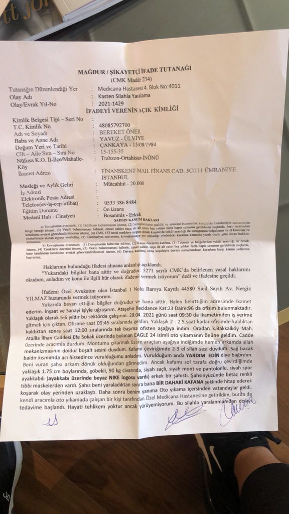 “Bu saldırıdan önce Sezgin Baran Korkmaz isimli şahıs hakkında Mali Şube Müdürlüğü tarafından yürütülmekte olan suçtan kaynaklı ‘Mal Varlığı Değerlerini Soruşturma’yla ilgili şahsın aleyhine ifade vermiştim. Bahse konu soruşturmayla alakalı İstanbul 10. Asliye Ceza Mahkemesi’nde 17 Mayıs günü duruşma tarihi verilmiştir. Bu dosya ile ilgili verdiğim ifadeden dolayı hiç kimseden daha önce tehdit almadım. Ancak 27.04.2021 günü ismini Yalçın Gürük, 0532597… numaralı hattı kullanan Sezgin Baran Korkmaz’ın avukatı olarak bildiğim şahıs kendi telefonum olan 0542 278… numaralı telefonuma mesaj ve arama yolu ile ifademi değiştirmem için telefon, WhatsApp ve facetime üzerinden arayarak ifademi değiştirmem gerektiğini ve ‘Sen değiştir ki Sezgin rahatça Türkiye’ye giriş yapsın’ dedi. Şu an ismini hatırlamadığım başka bir avukatın olduğunu ve onunla Çağlayan Adliyesi’nde görüşmem gerektiğini, matbu şeklinde kendileri tarafından hazırlanan ifadeyi imzalamam gerektiğini söylediler. Bahsedilen ifadeyi Yalçın isimli şahıs WhatsApp üzerinden bana attı. Bu mesajlar telefonumda kayıtlıdır. Ben Yalçın isimli şahsa ifadeyi okuyup bilgi vereceğimi söyledim. Daha sonra avukatım olan Nergiz Yılmaz ile bu konuyu görüştüm ve daha önceden vermiş olduğum beyanlarımın arkasında durmam gerektiği kanaatine vardım. Sonrasında şahıslarla herhangi bir görüşmem olmadı. Ancak Sezgin Baran Korkmaz’ın suçtan kaynaklanan Mal Varlığı Değerlerini Aklama konusuyla alakalı verdiğim ifadeden dolayı beni vuran şahsın bu şahıslar tarafından, yani Sezgin Baran Korkmaz ve Bedirhan Esenlik tarafından yönlendirildiğini düşünüyorum. Bedirhan Esenlik, 0532 222… numaralı hattı kullanır. Şahıs, Sezgin Baran Korkmaz’ın adliye ve Emniyet’teki işlerini takip eder. Ayrıca dışarıdaki pis işlerini takip eder. Bedirhan isimli şahsın Ritz Carlton Oteli’nin Recidance bölümünde kaldığını biliyorum. Bu şahıs hakkında başka bilgim yoktur. Ayrıca Bedirhan’ın oğlu da avukattır ve avukat olan bu şahsın Serkan isminde yine avukat olan bir arkadaşı daha vardır. Benim İstanbul Adliyesi’nde devam eden davam ile ilgili komisyon başkanı olan Hüseyin isimli şahsa benim ifademin alınması konusunda baskı yaptıklarını biliyorum. Yakup Süt ve Yusuf Süt isimli şahıslar da Sezgin Baran Korkmaz’ın adamıdır. Ben bu şahıslardan bir yıl davacı olmuştum. Şahıslar Bakırköy Adliyesi’nce tutuklanarak cezaevine gönderildiler. Ancak şahıslar beni tehdit ettikleri ve psikolojik baskılardan dolayı korktuğum için şikayetimden vazgeçtim. Şahıslar da beraat ettiler. Silahla yaralanmam olayını Sezgin Baran Korkmaz yaptırdıysa Bedirhan Esenlik ve Yakup Süt yoktur isimli şahıslara yaptırmıştır.”