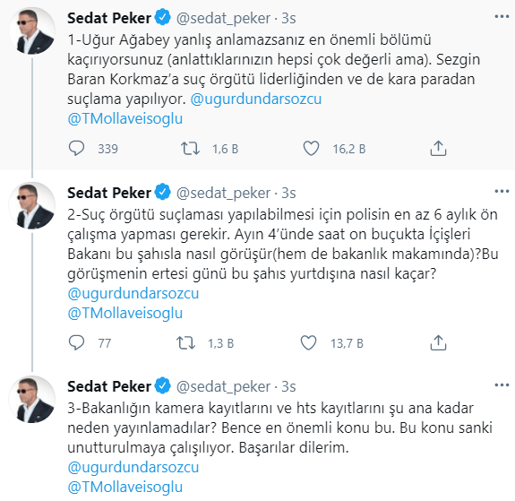Suç örgütü lideri Sedat Peker, sosyal medya hesabı üzerinden TELE1’de yayınlanan Anında Manşet programında açıklamalarda bulunan gazeteciler Uğur Dündar ve Tuncay Mollaveisoglu’yu etiketleyerek, ABD’nin isteği üzerine ‘kara para aklama’ gerekçesiyle gözaltına alınan Sezgin Baran Korkmaz’la ilgili sorular yöneltti.