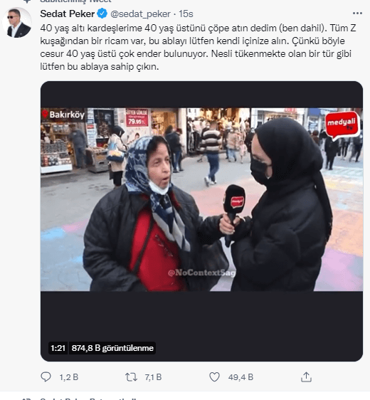 Sosyal medyada yayılan görüntüleri Sedat Peker de paylaşarak, “Z kuşağından bir ricam var, bu ablayı lütfen kendi içinize alın” ifadelerini kullandı.