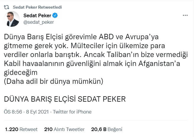 Organize suç örgütü lideri Sedat Peker attığı son tweette AKP Genel Başkanı ve Cumhurbaşkanı Tayyip Erdoğan’ın kitabına isim vermeden değindi ve Kabil’e gidiyorum dedi.
