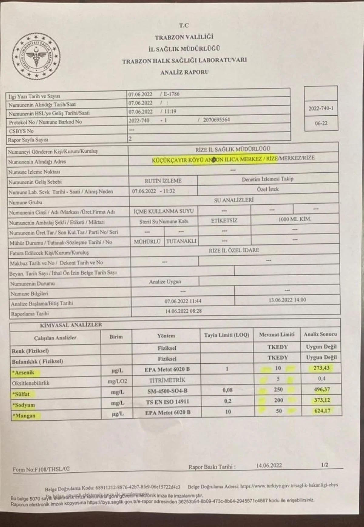 Andon’daki ılıca suyundan Rize İl Sağlık Müdürlüğü Halk Sağlığı Hizmetleri Başkanlığı’nca analiz için 7 Haziran 2022 tarihinde alınan numune, ılıca suyunu içme suyu olarak tüketenlerin adeta kanseri ayağına çağırdığını ortaya çıkardı.
