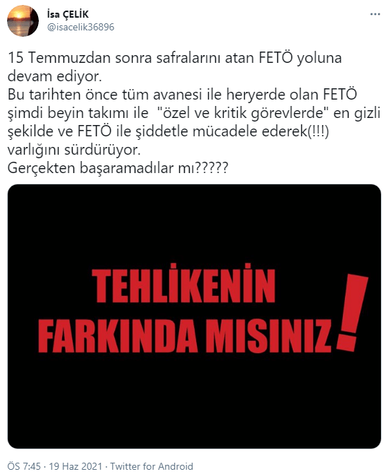 “15 Temmuzdan sonra safralarını atan FETÖ yoluna devam ediyor. Bu tarihten önce tüm avanesi ile heryerde olan FETÖ şimdi beyin takımı ile “özel ve kritik görevlerde” en gizli şekilde ve FETÖ ile şiddetle mücadele ederek(!!!) varlığını sürdürüyor. Gerçekten başaramadılar mı?????”
