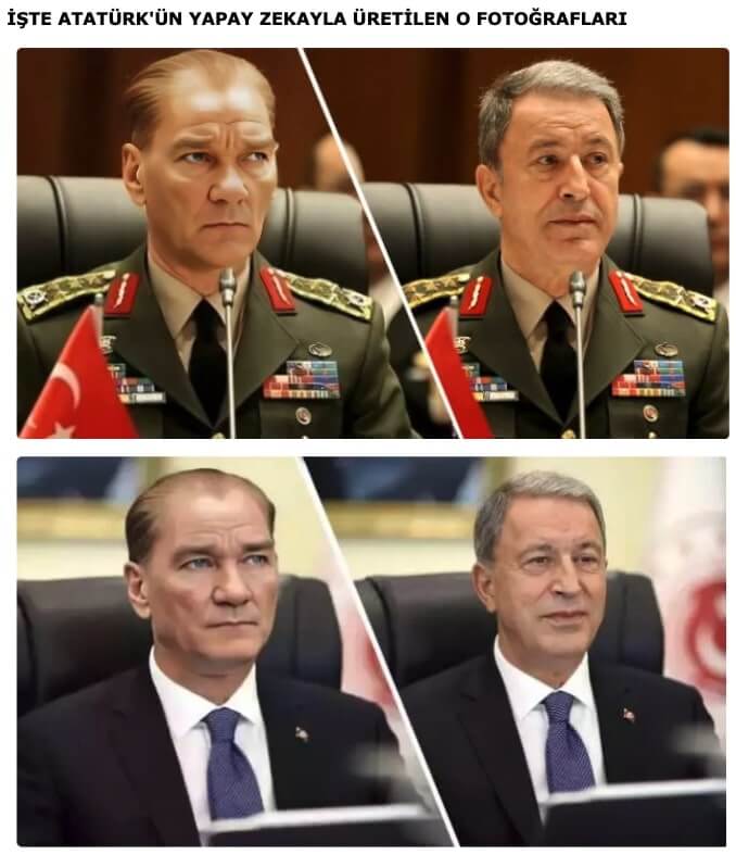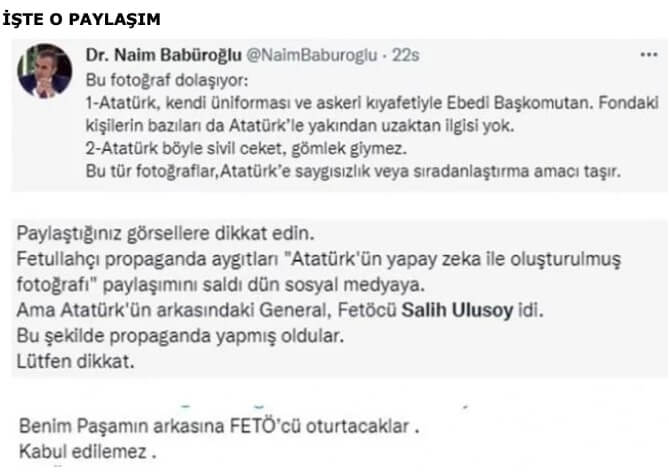Fotoğrafın aslında Milli Savunma Bakanı Hulusi Akar’a ait olduğu, Mustafa Kemal Atatürk’ün bu fotoğrafa photoshop yöntemiyle taşındığı ortaya çıktı. Ayrıca fotoğrafın arkasında görülen ismin ise ‘FETÖ’den hüküm giyen Salih Ulusoy olduğu iddia edildi.