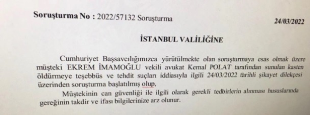 İhbar mektubunun İBB’ye ulaşmasının ardından İmamoğlu’nun avukatlarından Kemal Polat İstanbul Cumhuriyet Başsavcılığı ve İstanbul Valiliği’ne konu ile ilgili şikayette bulundu.