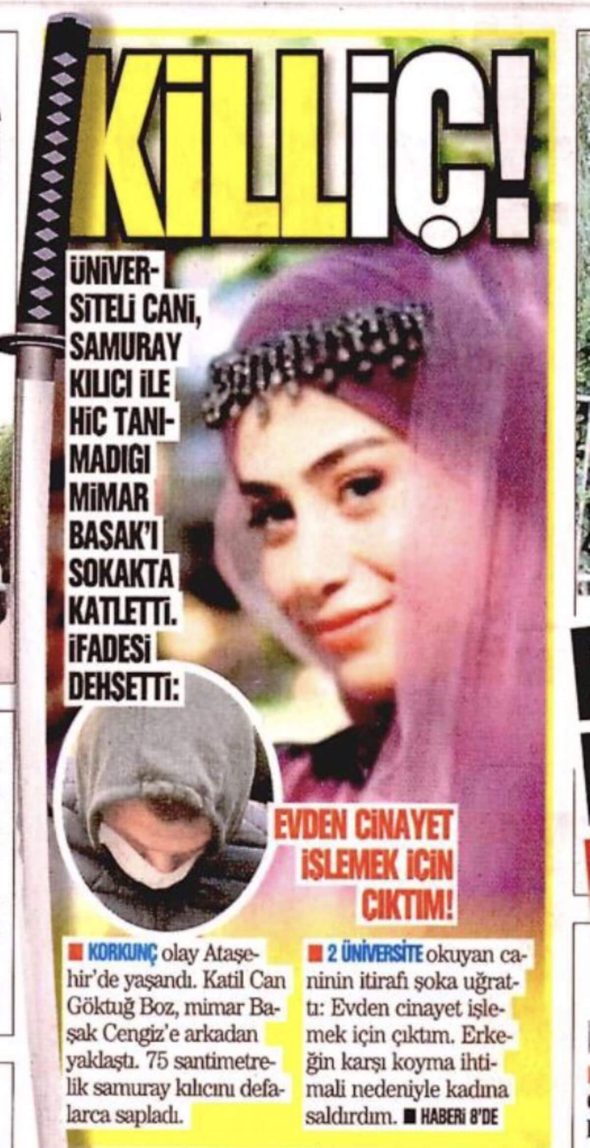 Gazete, söz konusu habere ‘Killiç’ başlığı atarken; Başak Cengiz’in fotoğrafının yanına bir de ‘samuray kılıcı’ resmi ekledi.