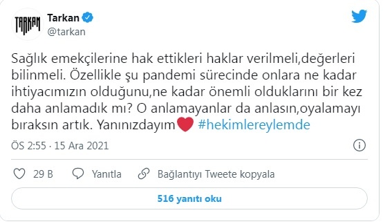 Tarkan da Twitter hesabından yaptığı paylaşımda, sağlık emekçilerine destek verdi.