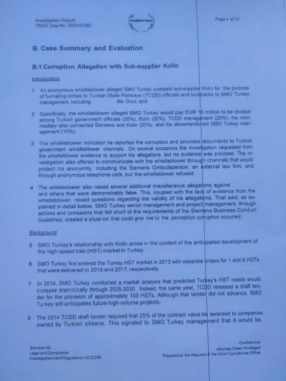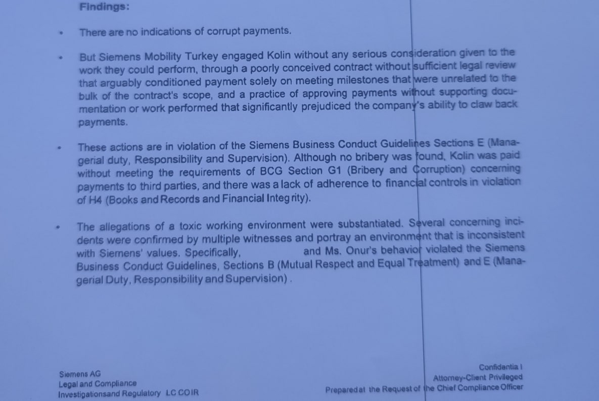20 Eylül 2021 tarihli rapor, “Siemens Mobility Türkiye şirketinde yolsuzluk ve toksik çalışma ortamı iddialarına yönelik soruşturma” başlığını taşıyor.
