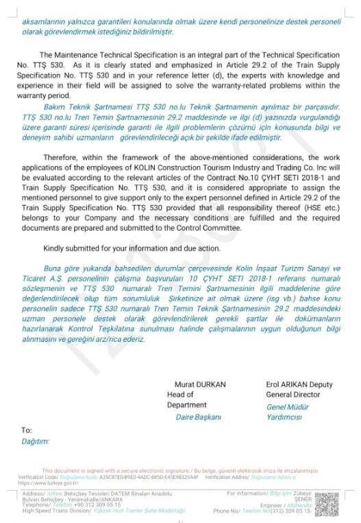 TCDD, açıklamasında Kolin’den habersiz görünse de TCDD’nin resmi yazışmalarında Kolin’in adı geçiyor. 14 Ekim 2021 tarihli, TCDD Araç Bakım Dairesi Başkanlığı’nın hazırladığı yazıda, Kolin’in YHT projesinde destek ekibi olarak yer aldığı anlatılıyor.