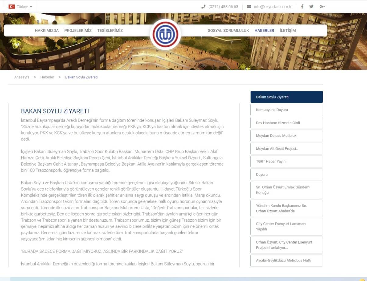 Bugün Özyurt A.Ş.’nin resmi sayfasını açın. Sizi en yukarıda ‘Bakan Soylu ziyareti’ başlıklı haber karşılıyor. Bir inşaat şirketinin sitesinde, demir ve çimento haberlerinin de önünde neden Bakan’ın açıklamaları var diyebilirsiniz? Elbette Özyurt Ailesi’nin yönettiği hemşehri derneğinin baş konuğu, konuşmacısı olduğu için. Müşavire sorarsanız tanışmıyorlar bile.