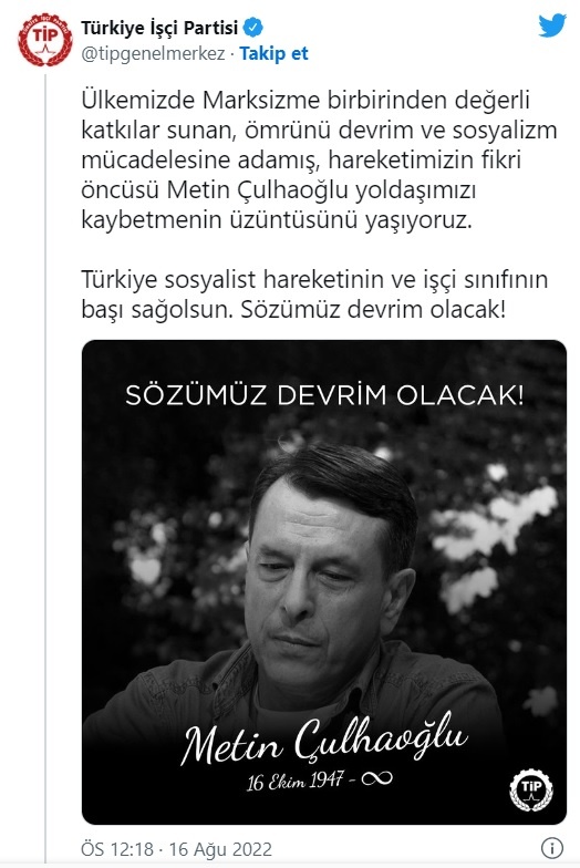 “Ülkemizde Marksizme birbirinden değerli katkılar sunan, ömrünü devrim ve sosyalizm mücadelesine adamış, hareketimizin fikri öncüsü Metin Çulhaoğlu yoldaşımızı kaybetmenin üzüntüsünü yaşıyoruz. Türkiye sosyalist hareketinin ve işçi sınıfının başı sağolsun. Sözümüz devrim olacak!”
