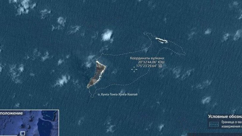 Güney Pasifik’teki ada ülkesi Tonga’da 15 Ocak’ta meydana gelen su altı yanardağı patlaması sonrası Rusya Federal Uzay Ajansı (Roscosmos), patlamanın meydana geldiği yanardağın birleştirdiği ikiz ada adalar Hunga Tonga-Hunga Haapai’nin uzaydan çekilmiş son fotoğraflarını yayınladı. Patlamanın ardından söz konusu adaların büyük kısmının sular altında kalarak haritadan silindiği ortaya çıktı. Roscosmos, söz konusu fotoğrafın Canopus-V uydusu ile çekildiğini belirterek, adaların patlama öncesi sınırlarını çizgi ile işaretleyerek değişime dikkat çekti.