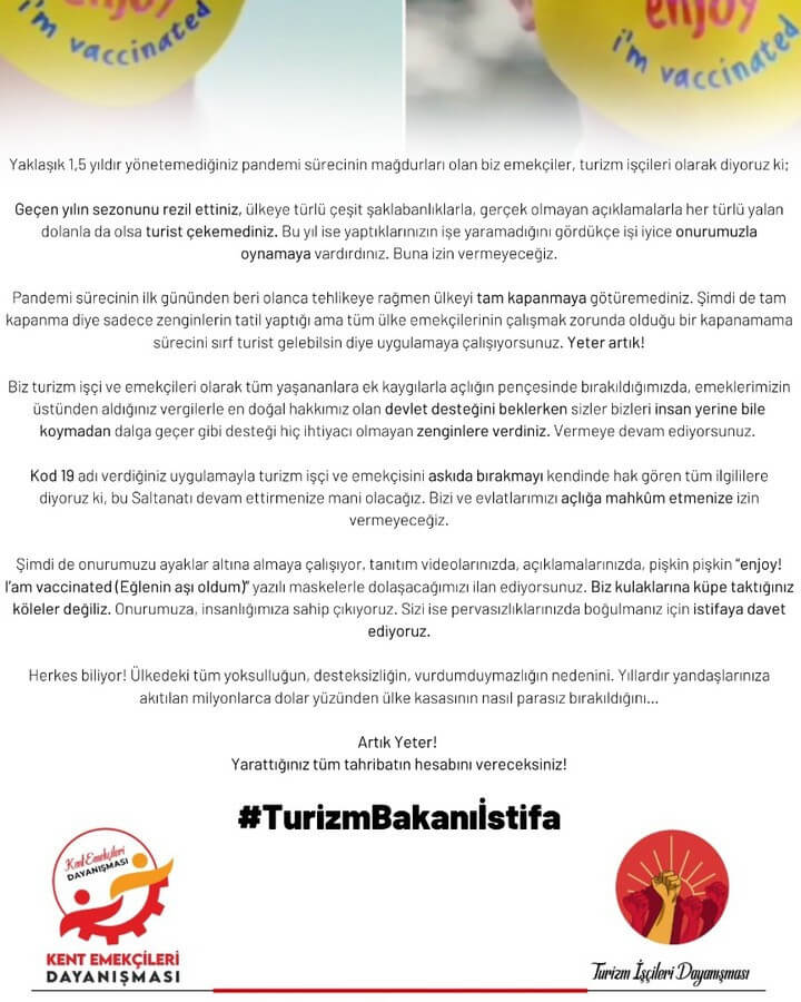 Kültür ve Turizm Bakanlığı tarafından İngilizce hazırlanan “Aşı oldum, eğlenin” maskeli tanıtım filmine tepki gösteren turizm işçileri, “Geçen yılın sezonunu rezil ettiniz, ülkeye türlü çeşit şaklabanlıklarla, gerçek olmayan açıklamalarla her türlü yalan dolanla da olsa turist çekemediniz. Bu yıl ise yaptıklarınızın işe yaramadığını gördükçe işi iyice onurumuzla oynamaya vardırdınız. Buna izin vermeyeceğiz” dedi.