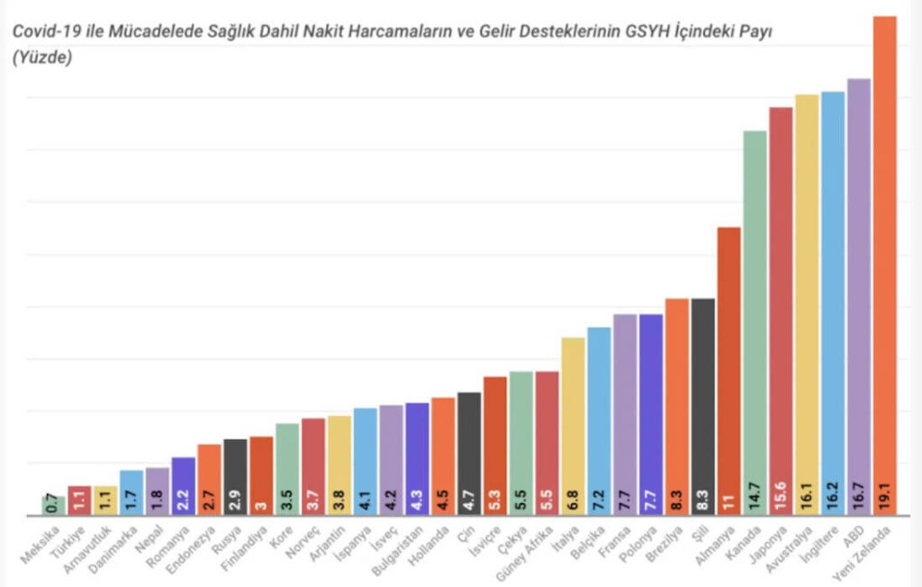 Almanya, Polonya, Fransa, İtalya, Belçika gibi AB ülkeleri ile Güney Afrika’da toplam sağlık dışı nakit harcamaların milli gelire oranı yüzde 5 ile 10 arasındadır. Romanya, Pakistan, Danimarka, Finlandiya, Endonezya, Rusya, Bulgaristan, Kore, İsveç, Norveç, Arjantin, İspanya, Hollanda, Çekya, Çin ve İsviçre’de sağlık dışı nakit harcama ve gelir destekleri ülkelerin GSYH’si içinde yüzde 1 ile 5 arasında değişiyor. Meksika, Nepal, Arnavutluk ve Türkiye’de ise sağlık dışı nakit harcamaların GSYH içerisindeki payı yüzde 1’in altındadır. Türkiye, Nepal ve Meksika’dan sonra ülkeler arasında Covid-19 döneminde çalışanlara nakdi desteği en az yapan ülke olmuştur. Türkiye’de bu oran yüzde 0,8 düzeyinde kalmaktadır.