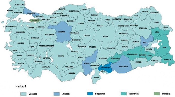 Atlasa göre, 67 ilde en çok veraset konusunda dava açıldı. Adıyaman, Diyarbakır, Batman, Siirt, Hakkari, Van ile Ağrı’da en çok tazminat, İstanbul, Ankara, Adana, Şanlıurfa ve Muş’ta en çok alacak, Yalova’da en çok tüketici davası açıldı. Gaziantep’te ise en çok boşanma davası açıldığı kayda geçti.
