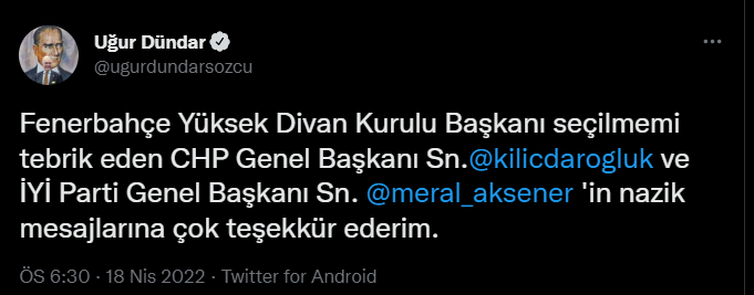 Dündar paylaşımında, ”Fenerbahçe Yüksek Divan Kurulu Başkanı seçilmemi tebrik eden CHP Genel Başkanı Sn.@kilicdarogluk ve İYİ Parti Genel Başkanı Sn. @meral_aksener’in nazik mesajlarına çok teşekkür ederim” ifadelerini kullandı.
