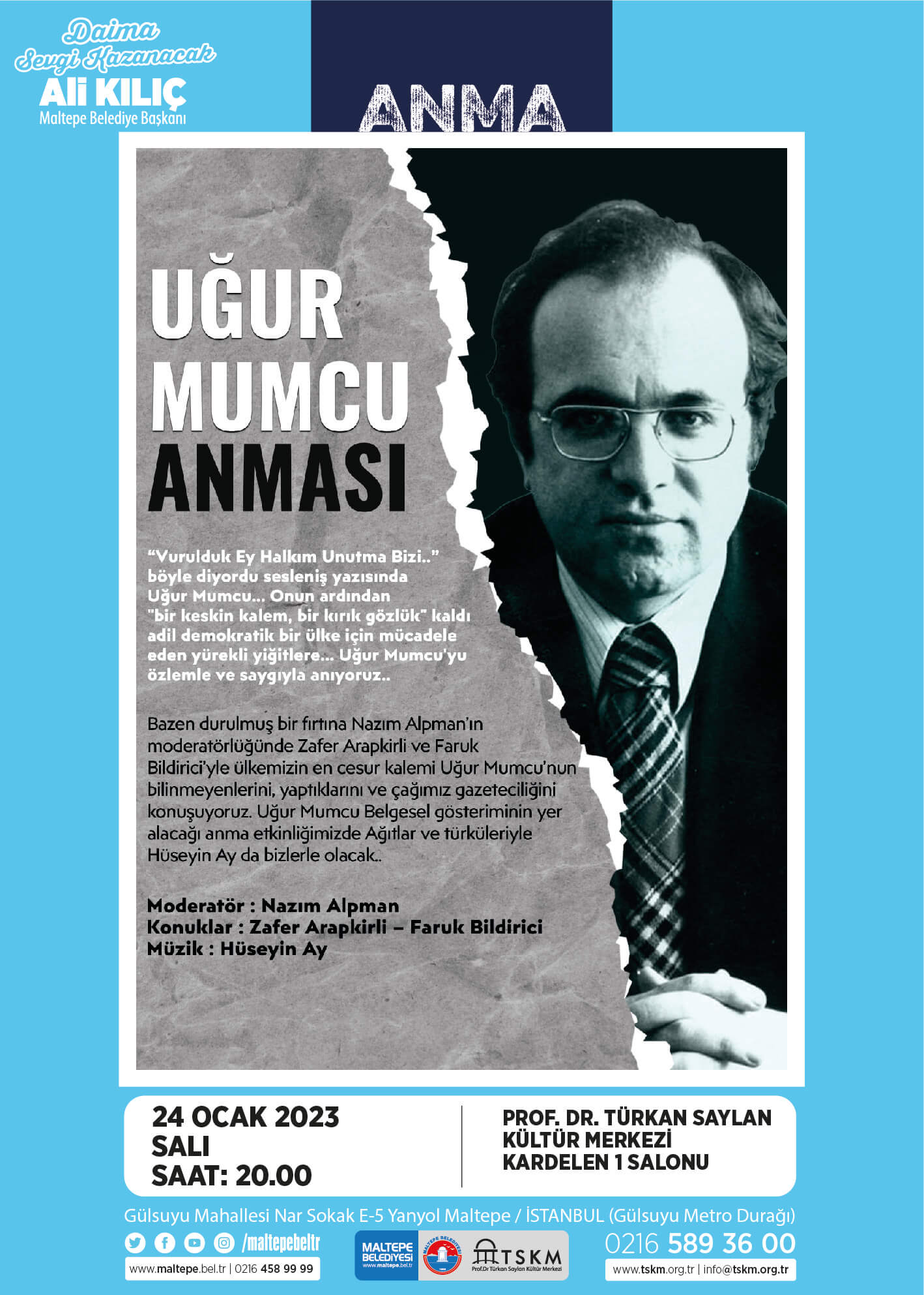 Maltepe Belediyesi, gazeteci-yazar Uğur Mumcu’yu, bombalı saldırıyla katledilmesinin 30. yılında düzenleyeceği programla anacak. Gazeteci-yazar Nazım Alpman’ın moderatörlüğünü üstleneceği “Uğur Mumcu Anması”, Mumcu’nun aramızdan ayrıldığı gün olan 24 Ocak Salı günü saat 20.00’de Maltepe Belediyesi Prof. Dr. Türkan Saylan Kültür Merkezi’nde düzenlenecek.