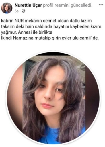 Uçar, henüz 15 yaşındayken hayatını kaybeden kızı Yağmur Uçar’ın fotoğrafını paylaşarak, “Kabrin nur mekânın cennet olsun ‘datlu kızım.’ Taksim’deki hain saldırıda hayatını kaybeden kızım Yağmur, annesi ile birlikte ikindi namazına mutakip Şirinevler Ulu Camii’nde” ifadelerini kullandı.