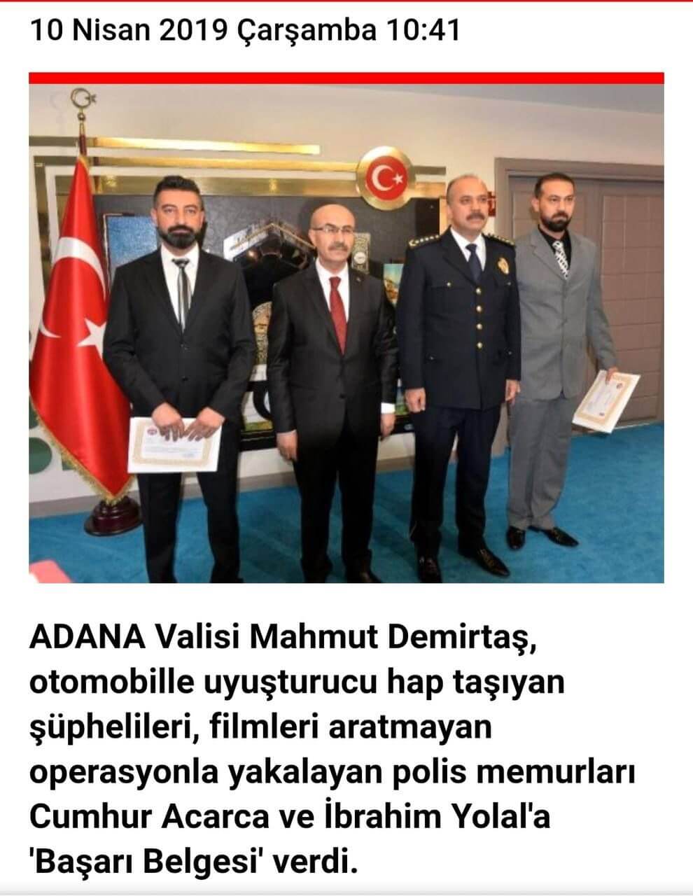 2019 yılında dönemin Adana Valisi Mahmut Demirtaş'ın uyuşturucu operasyonu nedeniyle başarı ödülü verdiği polis memuru Cumhur Acarca uyuşturucu operasyonunda yakalandı.