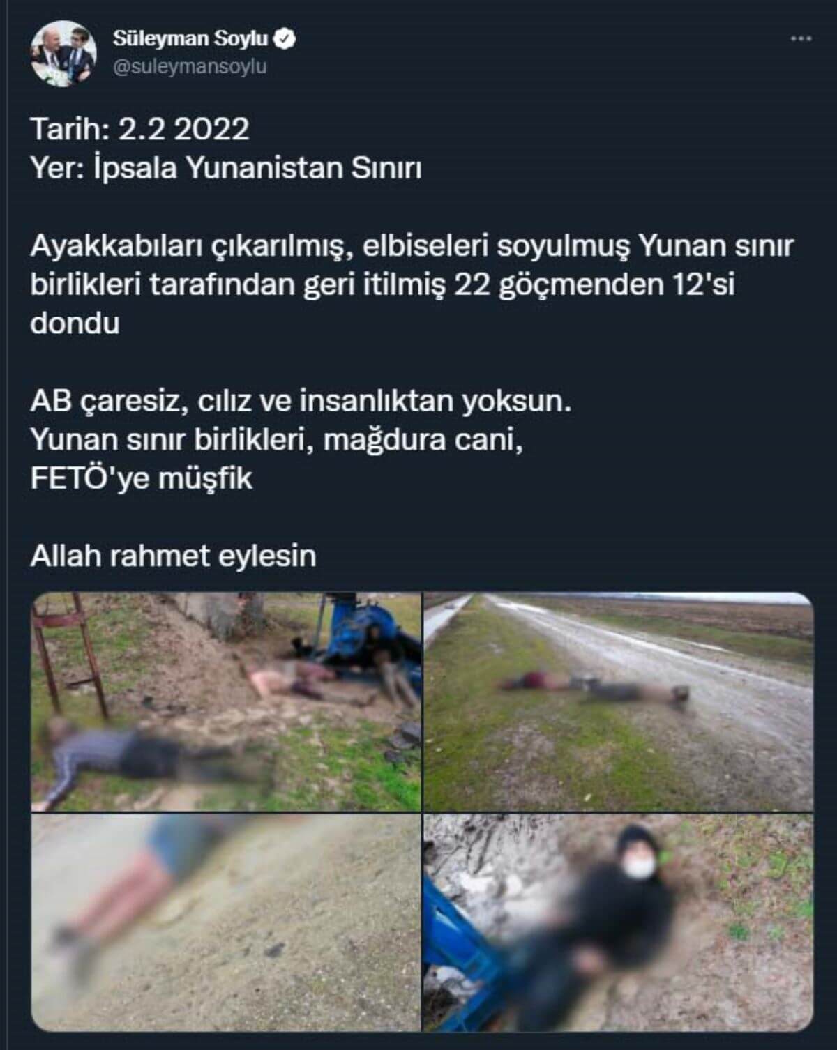 Bakan Soylu, Twitter hesabından yaptığı açıklamada, Donarak yaşamını yitiren göçmenlerin fotoğraflarını da paylaşan Soylu, “Yer: İpsala Yunanistan sınırı. Ayakkabıları çıkarılmış, elbiseleri soyulmuş, Yunan sınır birlikleri tarafından geri itilmiş 22 göçmenden 12’si dondu. AB çaresiz, cılız ve insanlıktan yoksun. Yunan sınır birlikleri, mağdura cani, FETÖ’ye müşfik. Allah rahmet eylesin” ifadelerini kullandı.