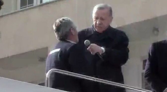 Erdoğan, konuşma yaptığı otobüsün üstüne gelen bir vatandaşa mikrofon uzattı. Vatandaş, “Hanımım hasta. Ben de KOAH hastasıyım. Bize bir yardımcı olun, indirim yapın” diyerek Erdoğan’dan yardım istedi.