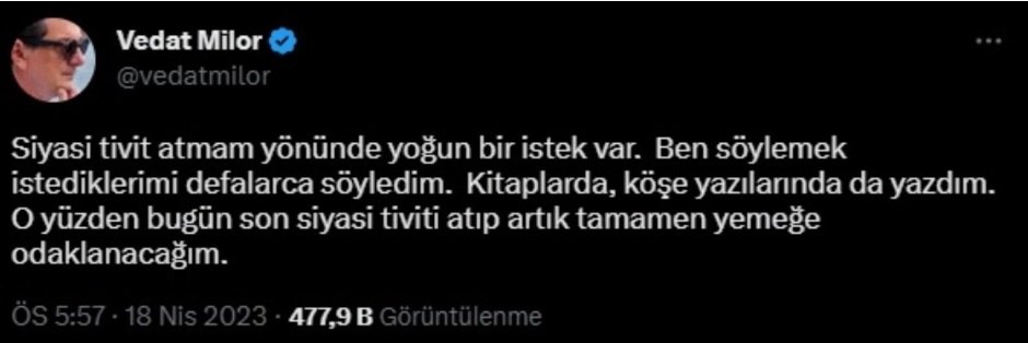 Ünlü isim, “Siyasi tivit atmam yönünde yoğun bir istek var.  Ben söylemek istediklerimi defalarca söyledim.  Kitaplarda, köşe yazılarında da yazdım.  O yüzden bugün son siyasi tiviti atıp artık tamamen yemeğe odaklanacağım” ifadelerini kullandı.