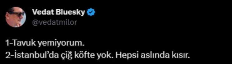 Gastronomi yazarı Vedat Milor, bu kez sosyal medya hesabından yaptığı çiğköfte çıkışı ile gündem oldu. Milor'un paylaşımı yüzlerce yorum aldı.