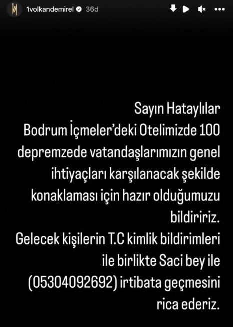 “Sayın Hataylılar, Bodrum İçmeler’deki otelimizde 100 depremzede vatandaşlarımızın genel ihtiyaçları karşılanacak şekilde konaklaması için hazır olduğumuzu bildiririz. Gelecek kişilerin T.C. kimlik bildirimleri ile birlikte Saci bey ile (05304092692) irtibata geçmesini rica ederiz.”