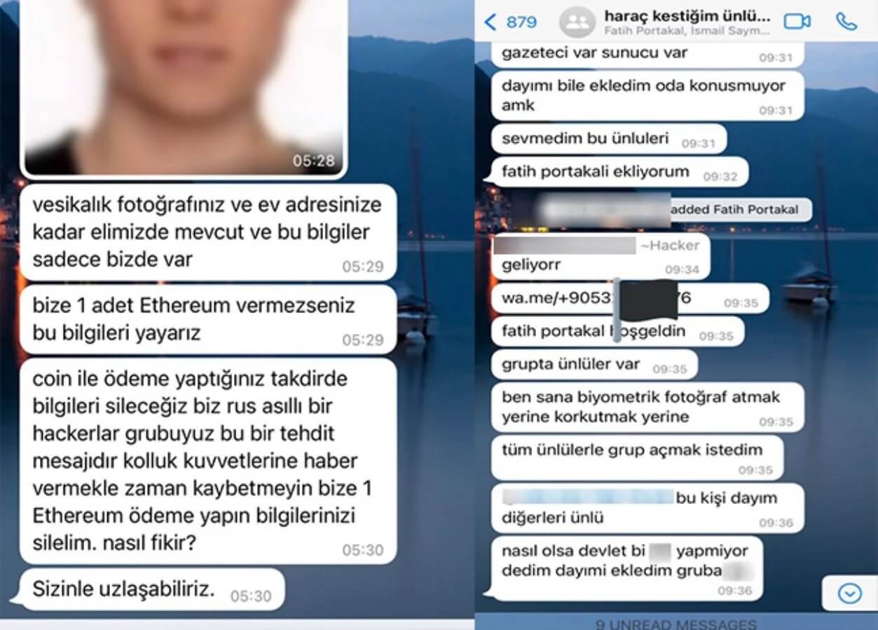 ‘Haraç kestiğim ünlüler’ adıyla açılan WhatsApp grubu konuşmalarında Rus asıllı hacker grubu olduğunu iddia eden kişinin, ünlü isimleri 1 adet Ethereum vermeme karşılığında bilgileri yaymakla tehdit ettiği görülüyor.