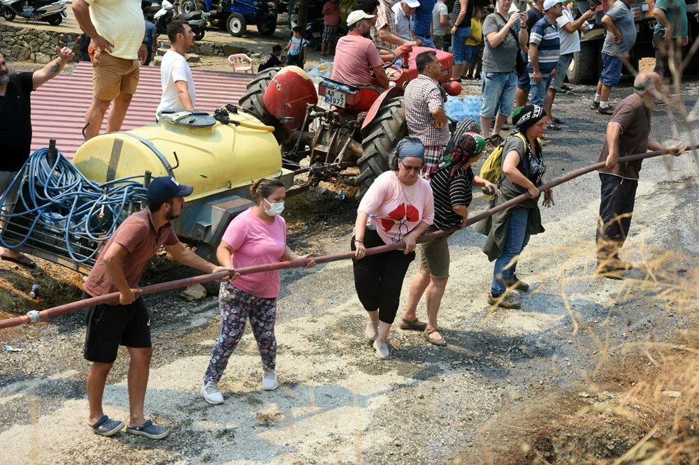 Türkiye‘nin birçok ilinde meydana gelen orman yangınlarını söndürme çalışmalarına katılan vatandaşlar, itfaiye ekiplerine destek olmak için kazmasını, küreğini kapan halk ormanlık alanlara ve toprak yollara çıkarak hem ekiplere yardımcı oluyor hem de su, ayran, tıbbi bakım ihtiyacı, gibi önemli ihtiyaçları karşılamak için çalışıyor. Evini barkını terk etmek zorunda kalan kişiler, söndürme çalışmalarına koşarak ekiplere yardımcı oluyor.