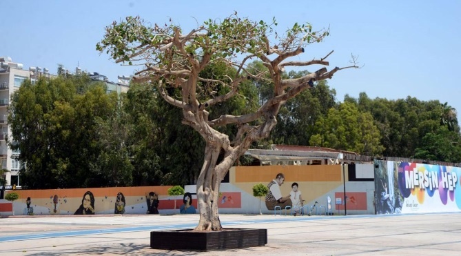 Yenişehir ilçesi Adnan Menderes sahilindeki Özgecan Aslan Barış Meydanının simgesi haline gelen yarım asırlık kauçuk ağacının yaprakları 10 gün önce kurumaya başladı.