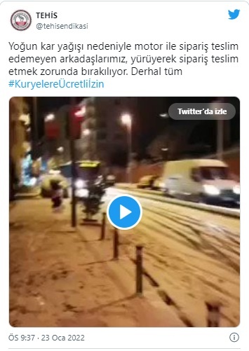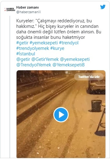 Sosyal medyadan seslerini duyuran kuryeler ise, “İstanbul’da kar şiddettni arttırdı. Tehlikeli anlarda çalışmayı reddedebiliriz. Biz şu anda çalışmayı reddediyoruz” dedi.