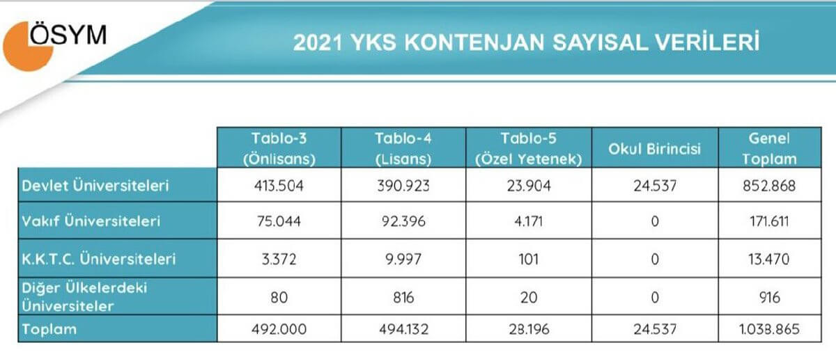 2021’de devlet üniversitelerine 852 bin, vakıf üniversitelerine 171 bin öğrenci kontenjanı ayrıldı. 4 yıllık lisans programlarına 494 bin ve 2 yıllık ön lisanslara ise 492 bin öğrenci yerleştirilecek.
