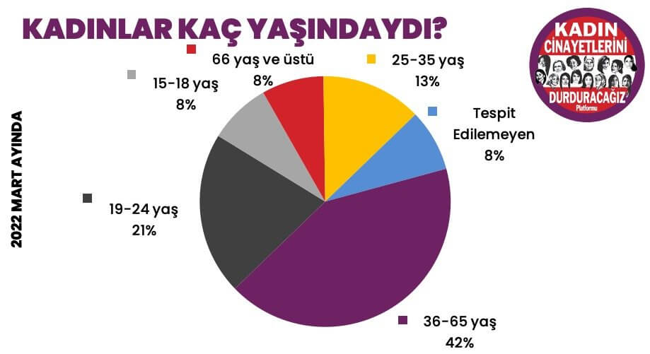 “Öldürülen 24 kadından 11’inin hangi bahaneyle öldürüldüğü tespit edilemedi. Mart ayında öldürülen 24 kadının 11’i evli olduğu erkek, 3’ü birlikte olduğu erkek, 2’si akrabası, 2’si eskiden birlikte olduğu erkek, 2’si eskiden evli olduğu erkek, 1’i babası, 1’i oğlu, 1’i tanımadığı biri ve 1’i de kendini ısrarlı takip eden biri tarafından öldürülmüştür. Bu ay kadınların yüzde 46’sı evli olduğu erkek tarafından öldürüldü.